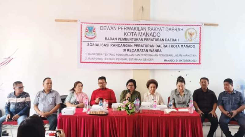 MANADO, BAS – DPRD Kota Manado melalui Bapemperda melakukan Sosialisasi Rancangan Peraturan Daerah (Ranperda) tentang pengamanan dan pencegahan penyebarluasan narkotika dan Ranperda pengarusutaman Gender (PUG), di Kecamatan Wanea, Selasa (24/10/2023).