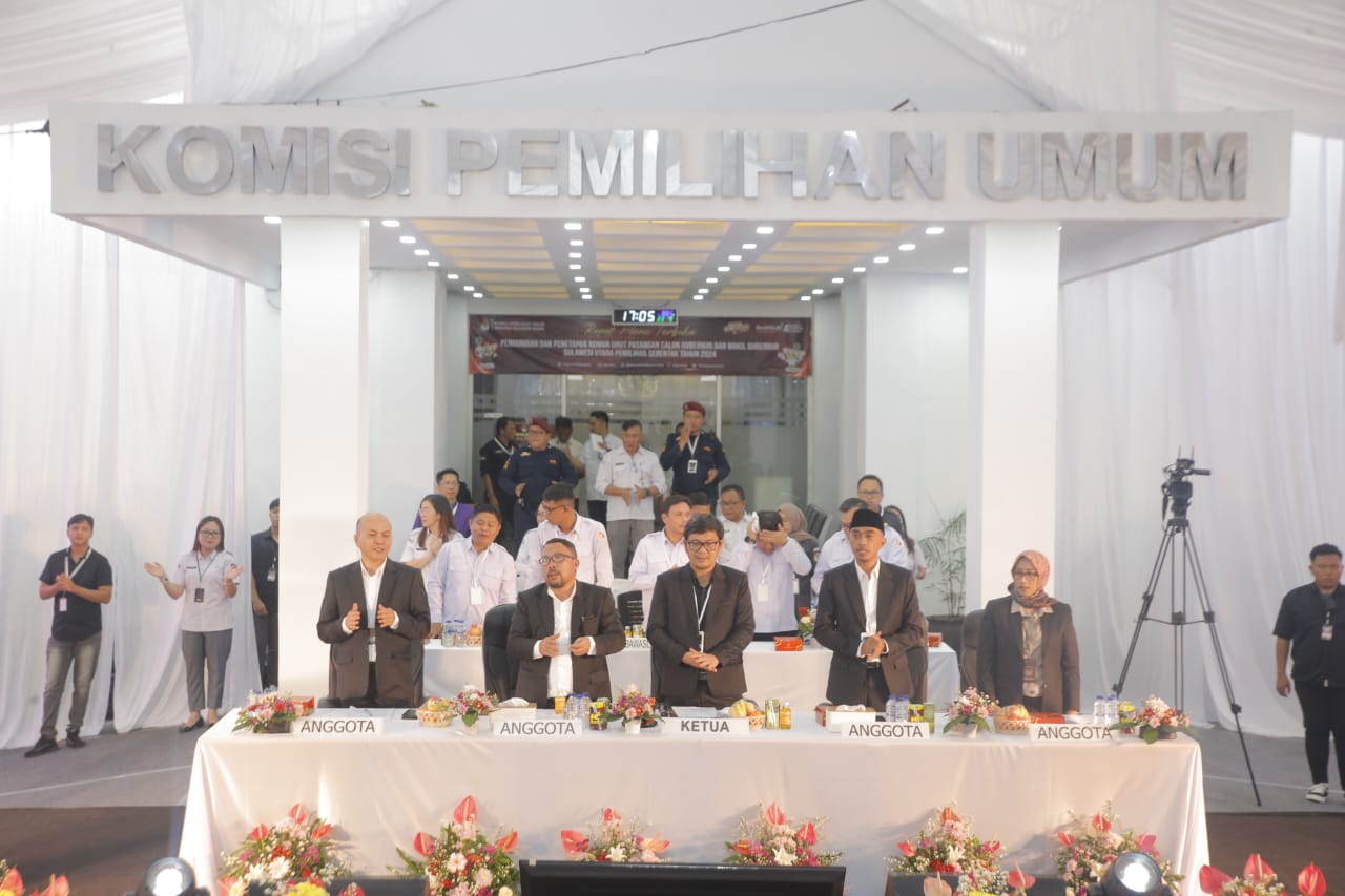 MANADO, BAS- KPU Sulut menggelar Rapat Pleno Terbuka Pengundian dan Penetapan Nomor Urut Pasangan Calon Gubernur dan Wakil Gubernur Sulut di Pilkada tahun 2024. Kegiatan ini berlangsung di halaman Kantor KPU Sulut, senin (23/09/24).